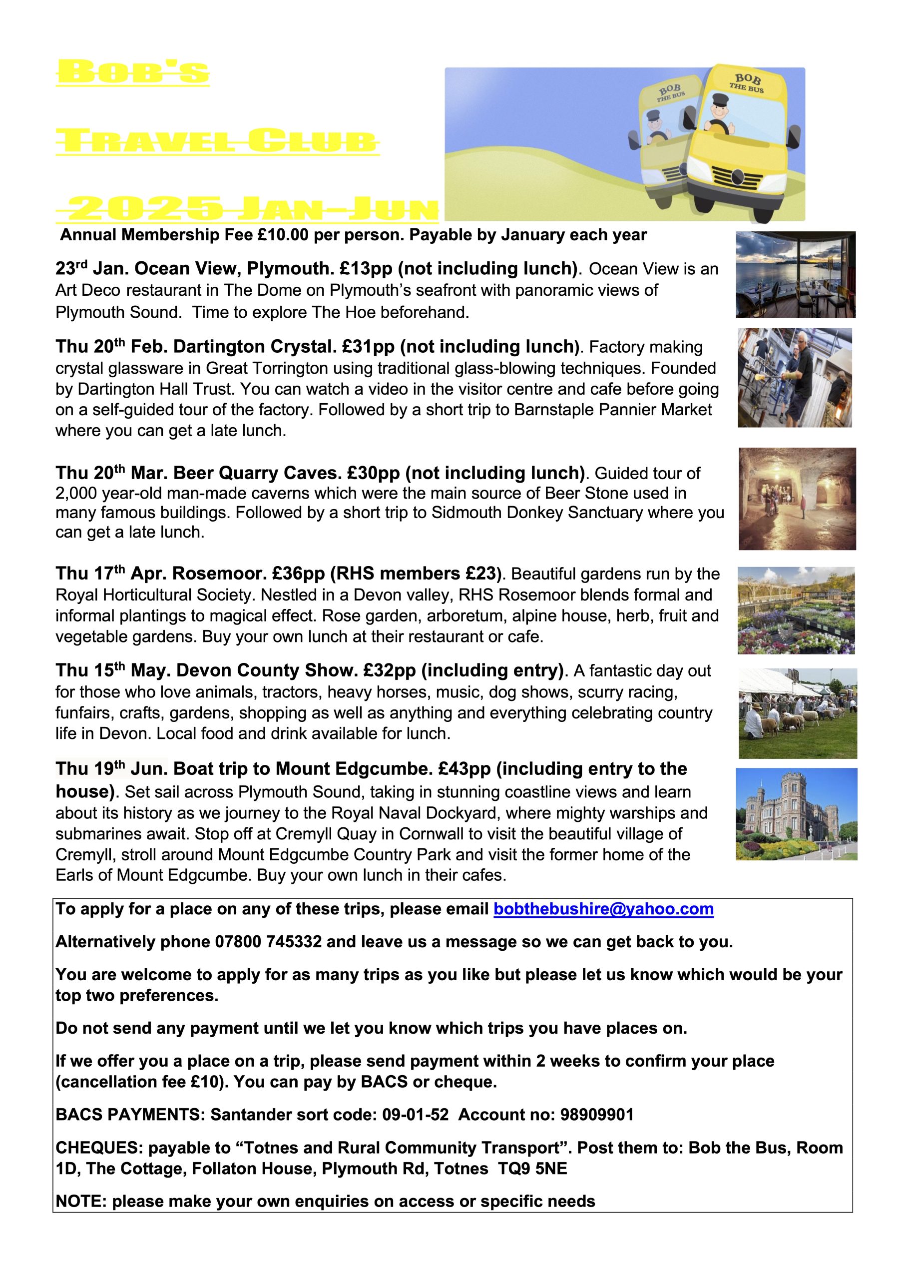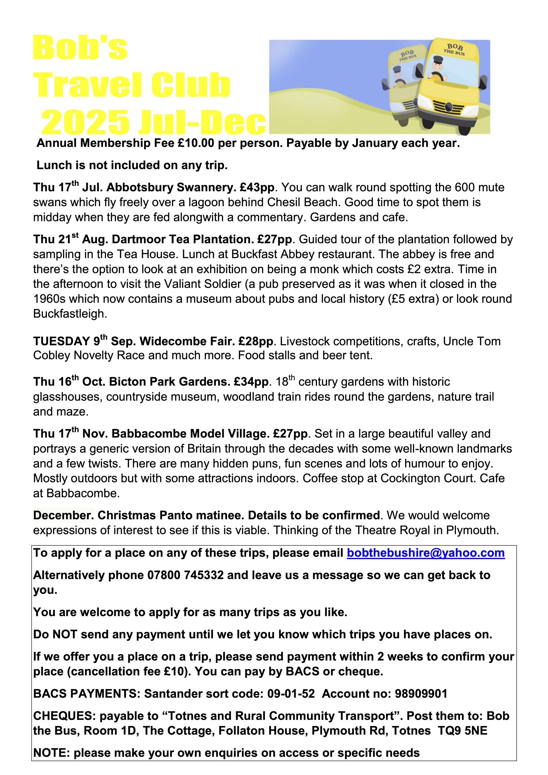 The travel club offers members travel all year round to a range of exciting and varied places in the beautiful South West and beyond. Bob’s Travel Club is open to people of all ages and abilities and the club welcomes new members throughout the year.
